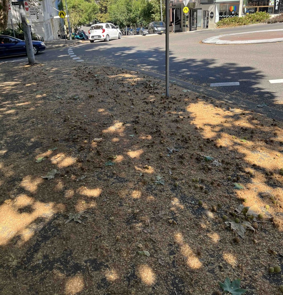 February 2026: Streets in Elizabeth Bay and Potts Point are covered in fallen plane tree litter including mounds of pollen, carpets of slippery leaves and the plane trees’ round, marble-like seed pods. These are potential tripping and slipping hazard for anyone using these footpaths. This has been reported twice to the Sydney City Council but meaningful response has been slow in coming. Residents pay rates expecting that the streets and footpaths be clean and safe for use, and that potentially dangerous debris will be removed ASAP.