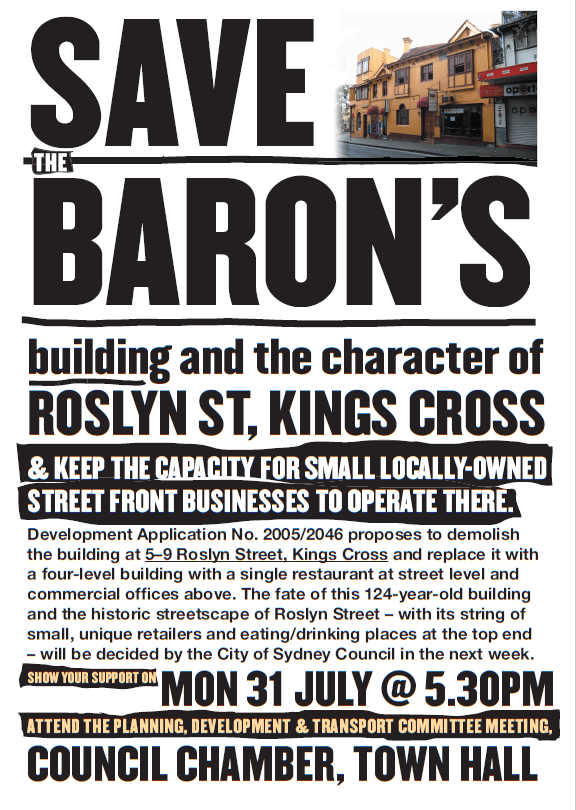 In 2005 Council received an application to develop the 124-year old Baron’s building, located at 5-7 Roslyn Street, Kings Cross. The building was to be demolished and replaced with a four-level with a single restaurant at street level and commercial offices above.