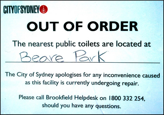 On 4 January 2014 all three toilets were still not working. Three green portaloos had been placed near these out-of-order toilets.. On each toilet door sign there was a sign (see photo above) saying “OUT OF ORDER. The nearest public toilets are located at Beare Park [Elizabeth Bay]”.