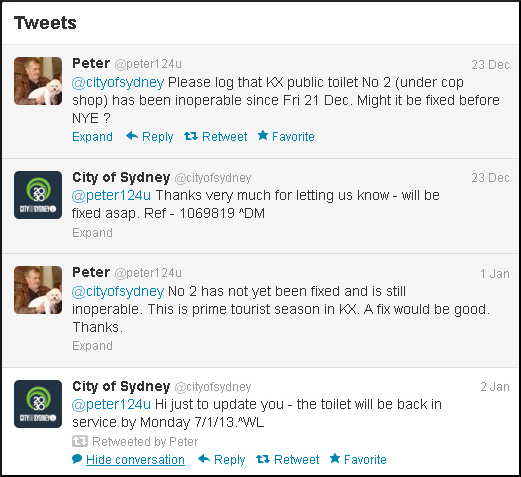 On 21 December 2012 Toilet No. 2 broke down and was unusable. It was out of order for 16 days — right throughout the extremely busy Christmas and New Year season (from 21 December 2012 into the first week of January 2013), despite Council having been informed shortly after the problem first occurred.