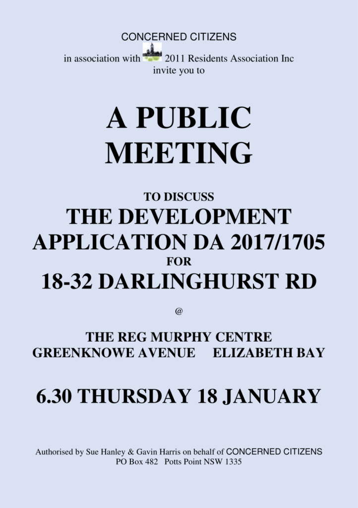 10 reasons Council should reject DA 2017/1705 (18-32 Darlinghurst Road, Potts Point) as presented to public meeting held at Reg Murphy Centre on 18 January 2018