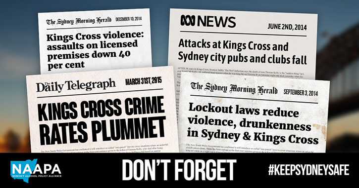 Some people have attempted to rewrite history, saying the lockout laws were a kneejerk reaction and a “sledgehammer blow” (Sydney’s Lord Mayor Clover Moore, Sky News Australia). In fact the lockouts were a rational response by Government to increasing violence on the streets of Kings Cross and Sydney’s CBD which culminated in five deaths in three years: